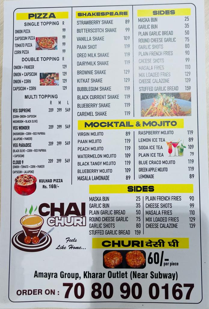 Complementing the star of the menu are delightful sides, such as Maska Bun at ₹25.00 and Masala Fries for ₹110.00, which are perfect for sharing (or not!). Don't forget to indulge in the Cheese Calazone at ₹139.00, just the right kind of cheesy goodness that brings comfort with every bite. The focus on quality and taste truly shines through, making every visit to Chai Churi a flavor-packed delight.